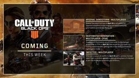 Április 29. -ig továbbra is megszerezhető az első Black Ops 4 Twitch Prime customization pack, ami egy jump pack -et (Blackout), egy egyedi weapon camo -t, és egy rare minősítésű outfit -et tartalmaz.