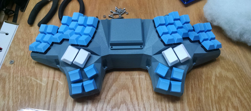 Első körben amúgy nem bonyolítanám túl, szerintem a 4x5-ös Dactyl klaszterekkel lemásolnám a Kinesis Advantage 2 házdizájnját (ez örök liebling) egy kis módosítással, hogy fixen 440 x 156 mm legyen + integrált pointer eszköz, aztán ha azzal sikerül megépíteni, utána még lehet ezzel-azzal kísérletezgetni.