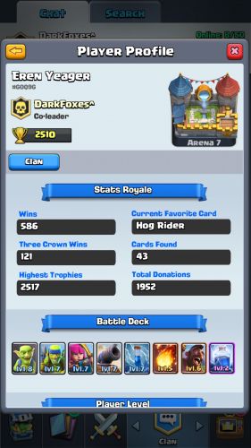 Én ahogy tudok donatelek a klánba ahol vagyok, de még így is csak 6. szinten vagyok. (663/1000) Éppen előbb sikerült felküzdenem magam aréna 7be. Lehet most itt megpihenek pár napig, hátha kapok az ingyen ládából valami jobb lapot. Ezek a kártyák hiányoznak: