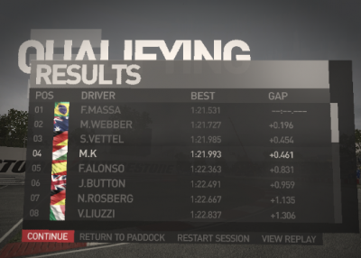 (A pilóta a valóságban már kiszállt volna és nyomott volna egy "barackot" a nyalókás emberre, az kétségtelen.)A másik gondom továbbra is az időmérőn (néha a versenyen) a kicsúszásból eredő büntetés ("-levágás" miatt).