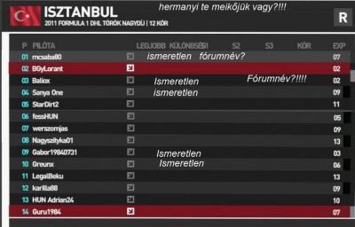 sanya oneval ugy volt hogy miden kanyarba bementem mellé külső íven picit mindég meglökött és ez által ez a f1 azt írta ki h le szeltem a kanyart 4x kaptam box áthajtásost mire megelőztem sanyát majd besz@rtam. azután jött a fekete leves picit ha le is vágtam nem h figyelmeztetett volna ,rögtön jött a büntetés! azt hittem a falra mászok.....már nem is tudom meik a jobb választás ha lággyal indulok vagy keménnyel,ha keménnyel akkor szopok rendesen ,vagyis ma beszoptam,azt sem tudtam kik ezek az ujak,azon gondolkodtam,lehet valami régen látott nem kívánt személyek akivel konfliktusom volt ,azért lökdelőznek ennyire. ááhh ,nagyon belemerültem ma .............