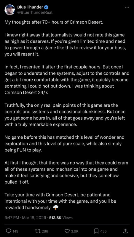 John Linneman (Digital Foundry) áradozik a Crimson Desertről: "Amit itt tapasztaltam, az talán a leglenyűgözőbb nyílt világú környezet, amit valaha is láttam bármilyen játékban. Utoljára talán a Red Dead Redemption 2-ben élhettem át ilyesmit" -