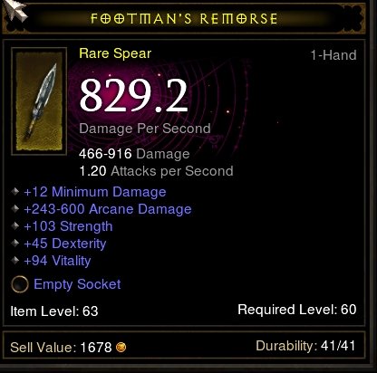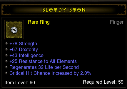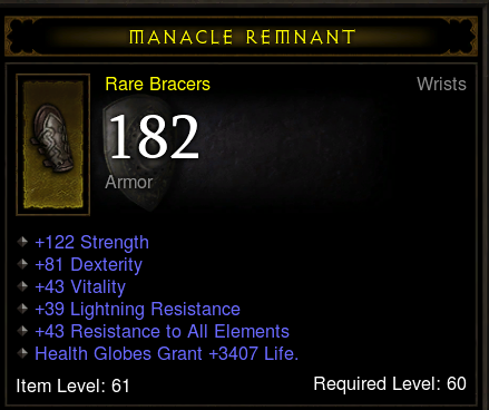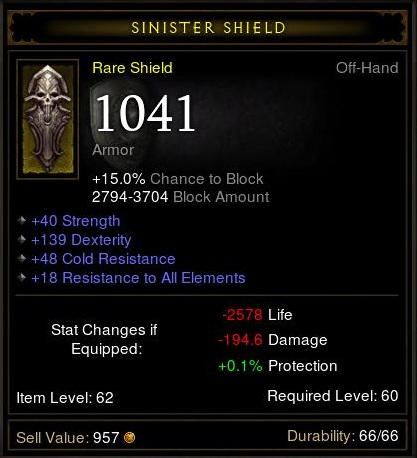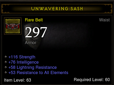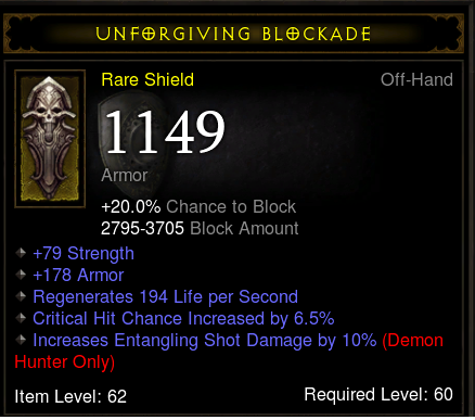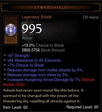 A stormshield meg még korlátozottabb. Speciális elvárásoknak nem felel meg. Blokkja lehet jó, van fixen közepes statpont és egész jó allres, de semmi kimagasló. Emellett vagy második stat, vagy armor, vagy critic lehet esetleg, de ezekből kettő ritka mindhárom pedig lehetetlen. Barbárnak hasznos, a többi kasztnak a str nem előny (egy jellemző kilőve)