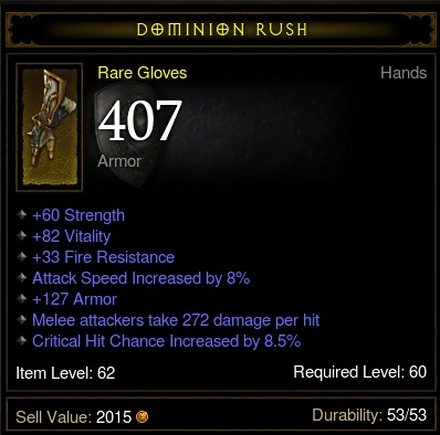 A Helm of command és a stormshield is jellemzőkorlátos: szűk határok közt mozoghatnak a fix jellemzőik és 1 vagy 2 szabad jellemző lehet rajtuk ami vagy szar vagy jó (no jó, a HoC épp kivétel a 4 jellemzővel, de ritka a nagyon jó belőle). A rare cuccokon nincs ilyen korlátozás. Lehet rajtuk jobb stat kombó és több hasznos tulajdonság. A blokk az kizárt, de így se a helms of command irányába billen a mérleg. Főként kétfegyveres vagy kétkezes fegyveres buildeknél.