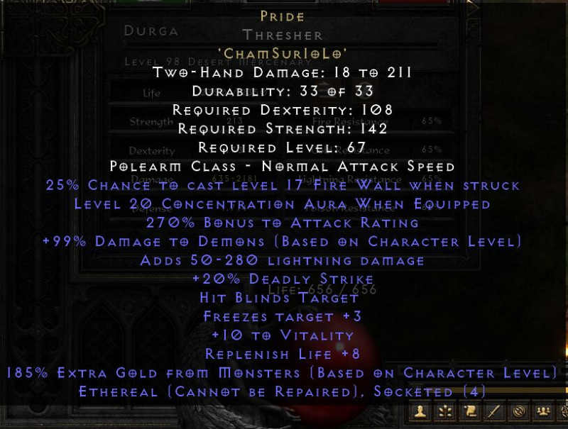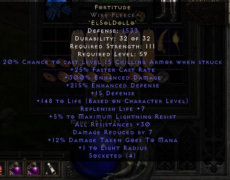 Nagyon csini lett. Annyit még hozzá, hogy mivel ez inkább egy melee Sorc, egy pici hp-t érdemes adni neki, mert az ES nem fog mindig kihúzni a szarból. A 800/1300 (6 bo) ideális számára. Ugyanez igaz a faster hitre is. Főleg ha offenzíven tolod és berepülsz valami fasza kis hangyabolyba. Egy 20-30 FHR nem fog megártani. Ez a 15k fire damage úgy van most neki, hogy nincs arach (+1) +3 fire amu (+1) és 2 skillert még be lehetne neki dobni. Valamint az 5 ench orb. Szóval fogom még feljebb tornázni úgy lvl 48-50-re. De első körben Infit akarok neki szerezni.