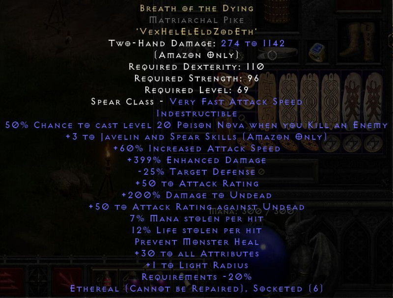 Megnéztem a MAXROLL SPEARZON útmutatót. Enigma helyett Fortitude. Szerintem! Matri Spear helyett eth War Pike. Bár a Matri Spear ad egy viszonylag egységes min/max sebzést, a War Pike BOTD más karival is használható. Nosferatus helyett SoE vagy Dungo. FCR ring helyett min dmg ar dual ring. A min dmg érezhető pluszt ad. Az FCR nem. Mivel van egy rakat damage + CS a CB-t nem kell túlzásba vinni. Gore elég. Guill helyett 3os 30 FRW circ/tiara vagy diadem. Bele IAS jewel a max FPA-hoz. CTA buff és 60-80 secen belül megvan Dia klón. És ehhez nem kell a HP-t sem az egekbe tolni. Menjen a dexre inkább.