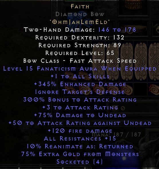 Az egy 15 aura 2 all skill 15 ed 3 ar, azaz full perf csoda volt 40 Jah-ért. Az enyém Diamond. Az egyetlen karakterem, amit lvl99-ig elvittem, az egy physical Bowa. Physicalnál nem számít a + 3 bow skill. Kb. lófing. Coldnál más a helyzet de ők sem rakják grandmatronba, mert magas az IAS igénye. Shadow és Diamond a legjobb Faith base.