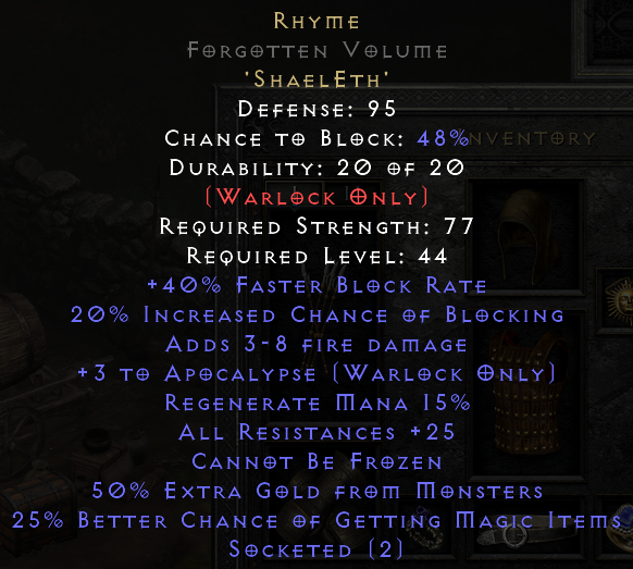 Meg lehet azért lenni Void meg Obsession nélkül is. A Void értékét tovább fogja növelni, hogy low vagy 15%-3-12. Utóbbi a Hammerdin kezében jobb, mint a Hoto de pótolni kell a bukott resistet és a rep lifeot szal nem HC-n lesz népszerű. Az Obsession-el szemben meg ott a Mang Songs bár ez sem esik minden sarkon és stat függő (értsd, egy perf éteri kész vagyon). Ez utóbbival inkább style pontra mennek end gameben.