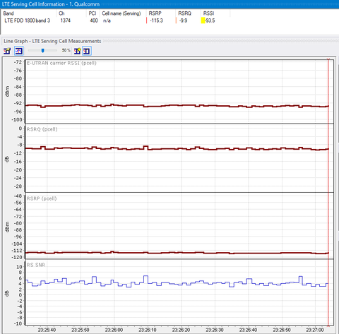Hát, mit mondjak. Üres hálózaton, gyakorlatilag kültéren -10dB körüli RSRQ és -115dBm körüli RSRP, 3-4dB SINR.