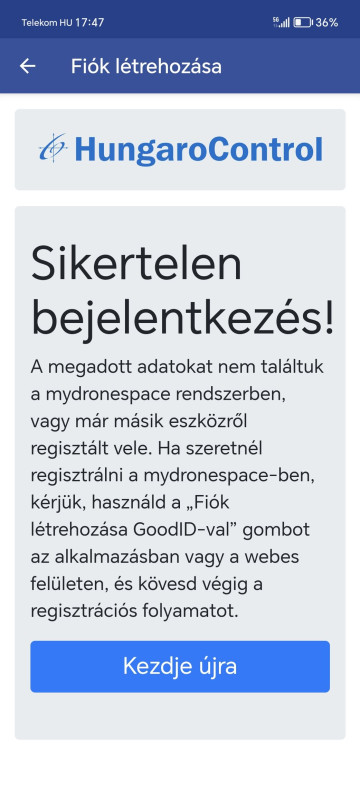 A GoodID-t gond nélkül megcsináltam, de mikor a Mydronespace alkalmazásban fiókot akarok csinálni, bekéri az GoodID-t, lefuttatja, dolgozik-gondolkozik, majd bedobja ezt a képernyőt: