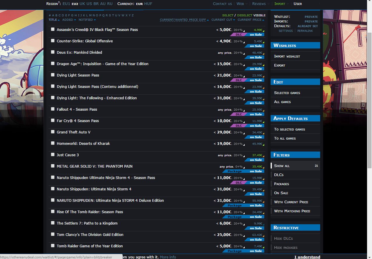 Érdemes az isthereanydealbe kicsit belemerülni, mert itt tudsz csinálni wish listet is, beállithatsz árakat, és hogy emailbe figyelmeztessen ha a megadott ár alá megy az adott dolog, és a wish listedet megnézve egy pillantásból látod hogy alakulnak az árak az általad kinézett dolgokra