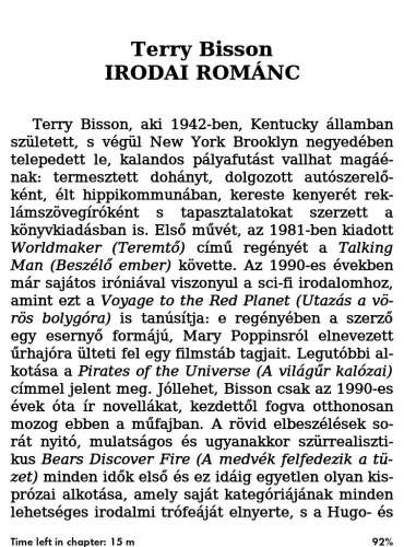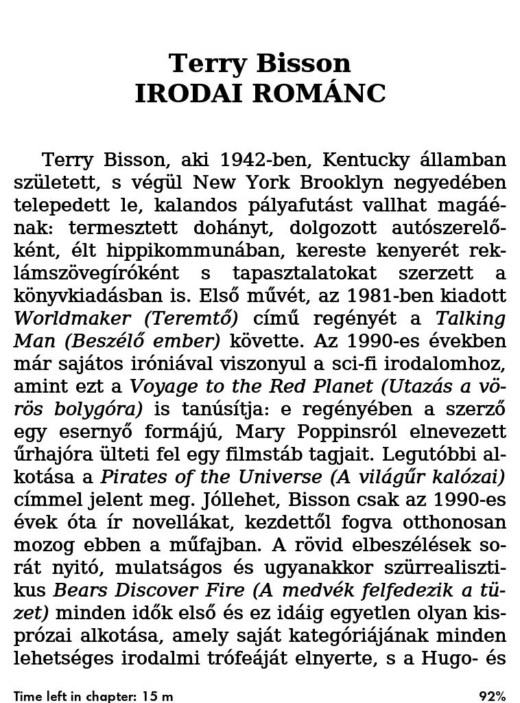 Ugyanígy a margó, sorköz stb. méreteit is.Ezt nem akarja megoldani az Amazon, erre céloztam fentebb hogy ez kellene egy elemi dolognak lennie egy csúcsolvasóban nem a (szerintem) olyan felesleges fícsör mint hogy mutassa hány perc múlva olvasok el egy fejezetet.