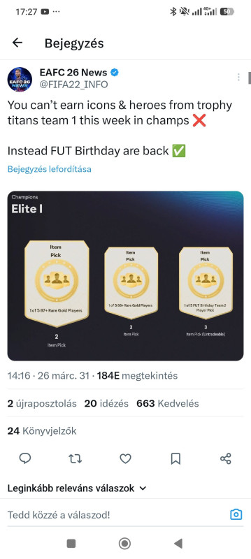 Ezt csináltam hetekig. Nem tudom mióta full Arsenal teammel tolom. Néha beraktam a Fantasy Felixet meg az FB Cancelot kipróbálni milyenek de azon kívül mindig mindenki Arsenal már január óta. Nekem egy játékban kell a motiváció, hogy legyen valami célom amiért megéri játszani. A mostani evok nagy része 88-89es lapokra jók maximum. Nekem a lapjaim 90-en vannak már, aki meg még evozható lenne mint Saliba,Gabriel,Rice,Havertz azokból 2-t már feleslegesnek tartok tekintve, hogy TOTS lapjuk jön +Mosquera,Hincapie,Calafiori ott van CB-be az utóbbi kettőnek meg annyi borzalmasan szar szürke playstyle van alapból, hogy az életben nem varázsolok belőlük használható kártyát.