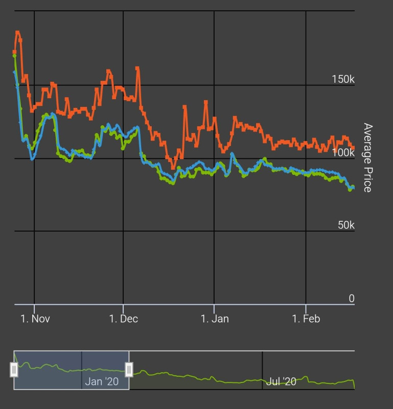 Ilyenek a Fifa 20-ban a Scream lapok ár grafikonjai. Ahogy jött a 99es stat váltás, mindig jócskán emelkedtek az árak.