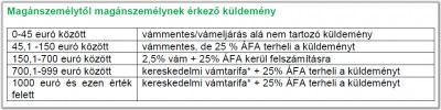 illetve az a 150Euró nem 150 hanem 45euró. ha meg cégtől vásárolsz akkor 22euró-ig vámmentes(egész pontosan, 45 ill 25 fölött fizetsz áfát(27%-t)) 150euró fölött(700-ig) 27%áfát+2.5% vámot is fizetned kell. -