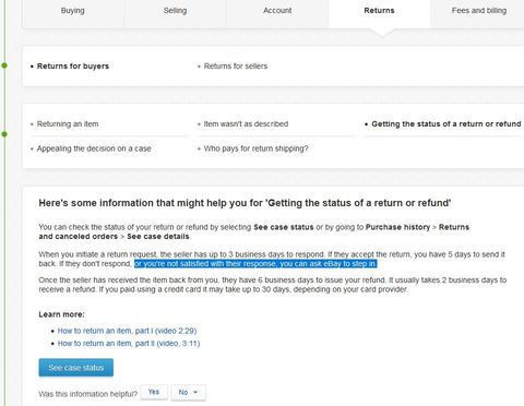 ReturnsA See case status előhozza az aktuálist a kiválasztás után és keresd a képen is látható szöveget: ..ask eBay to step in.