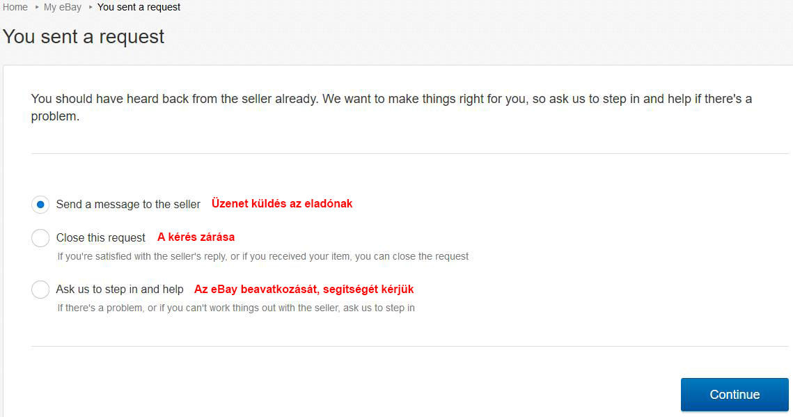 Ha erre nem vagy nem azt reagál amit szeretnél, akkor ott a requestnél a Ask us to step in and help link és kérd az eBay segítségét. Nem fog magától továbblépni. -