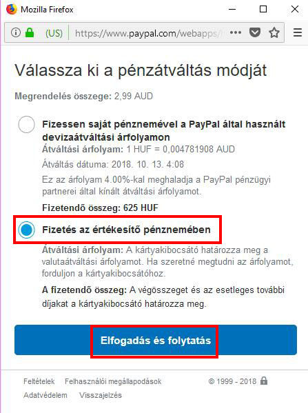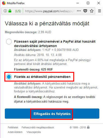 Akkor válaszd a More exchange rate options linket.A megjelenő képernyőn az alsó gomb választandó ahol nem a PayPal-ra utalnak, vagy magyarul, vagy angolul a Fizetés az értékesítő pénznemében választandó és az Elfogadás és folytatás gombra kattintva elmentendő, azután az előbb írt Card issuer will determine your exchange rate fog megjelenni.