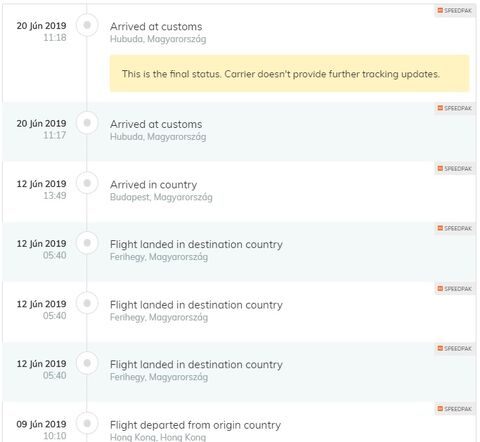Rendeltem az Ebay-ről terméket, az eladó SpeedPak szállítással küldte (ilyennel még nem volt dolgom). Miután elég furcsa a tracking szám, valószínüleg csak Magyarországig követhető, belföldön már nem. 6 nap alatt ideért Kínából, a nyomkövetés szerint már beérkezett, de 10 napja semmi más nem történt. Van valakinek tapasztalata ilyen szállítással, illetve a vámosok, vagy a postások a hitvány léhűtők, amikor ácsorog a cucc?