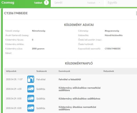 Viszont ma jelzett az ebay alkalmazás hogy frissült a nyomkövetés ránéztem és most azt írja hogy Hermes: 02120160001100 . Akkor most megváltozott a szállítás vagy a DHL az érvényes? Már a második eset hogy megváltozik a nyomkövető szám. -