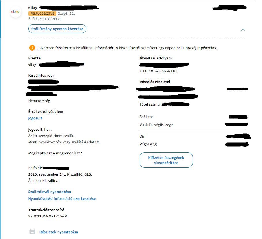 Az eladás nem a paypal on keresztül ment. Igazából nem is értem magam, hogy alakult ez így. Iban számlára Ausztriába küldtem a pénzt. A tranzakció után az ebay azt írta a termék fizetve. Nem gondoltam semmi rosszra.