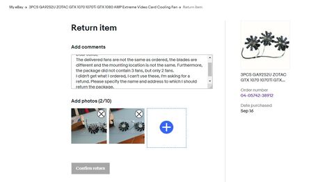 Eléggé ritkán rendelek ebay-ről és most belefutottam egy problémába. Nevezetesen rendeltem egy videókártyához 3 db-os ventilátor készletet, ebből egyrészt csak 2 db volt a csomagban és nem is olyanok a ventik mint ami az eladó oldalán lévő fotókon szerepel. Nyilván ha tudom, hogy nem olyat kapok mint ami a fotón van, akkor meg sem rendelem. Mi ilyenkor a teendő, kérhetek visszatérítést és ehhez vissza is kellene küldenem? Nem szeretnék visszaküldéssel foglalkozni mivel úgy érzem meg lettem vezetve, nem azt kaptam amit rendeltem, és a csomagon a cím sem látszik ahová küldeni kellene mivel mindenféle papírt ráragasztottak.Nemzetközi regiszrációs a csomag, ami csak Bp reptérig mutatja az utat. -