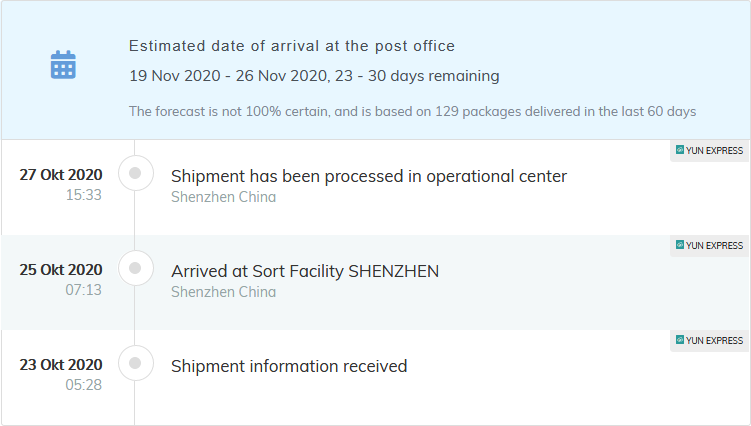 Akkor oké. Csak innen rákerestem egy-két yun expresses küldeményre, hogy legyen kiindulási alapom és náluk naponta történt esemény, ezért kérdeztem csak rá. Viszont a Shipment has been processed in operational center dátumát modosították 25-ről 27-re. Megmutatom azért. Valami csak történhetett itt.