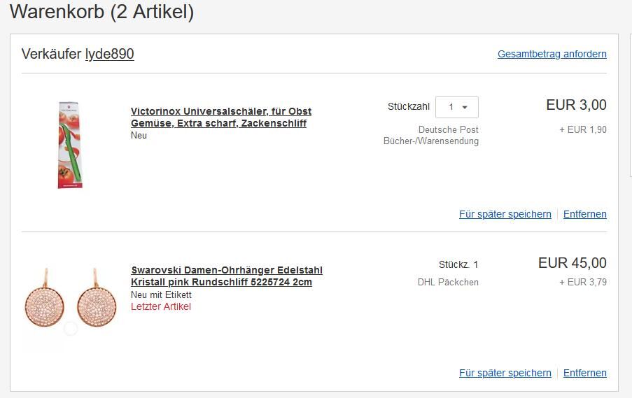 Az van hogy nem adott meg nemzetközi szállítást és ezért sajnos nem működik a számla kérés. Nekem most német címen állt és nem tűnt fel hogy nem csak Magyarország, hanem más ország sem. Bár annyit tegyél már meg hogy a német oldalon belépve próbálod meg mert a USA oldal nem minden esetben "átjárós". Bár ott meg azt kéri hogy 2 db valami legyen a kosárban viszont akkor már él a Gesamtbetrag anfordern link. Ha azonos a szállítás akkor más lehet a szállítási költség, bár én nem tudom "rábeszélni" hogy a magyar címemet vegye figyelembe és ezért van a képen szállítási díj, szóval azt neked kell leellenőrizni.