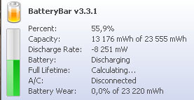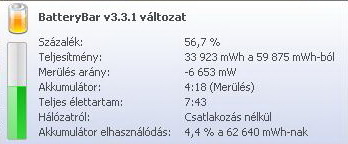 Huh a BatteryBar, elhasználódottságnak 2.375%-ot ír és a gép 3 napos, szerintetek ez nem sok? Amúgy mennyit bír másnak a gépe? Elvileg nekem 10.5 órát kellene bírnia de gyakorlatban játékkal nettel aktív használattal ez 5 max 6 órát jelent. (62 640mWh-s aksi a gép pedig 1005HA-H)