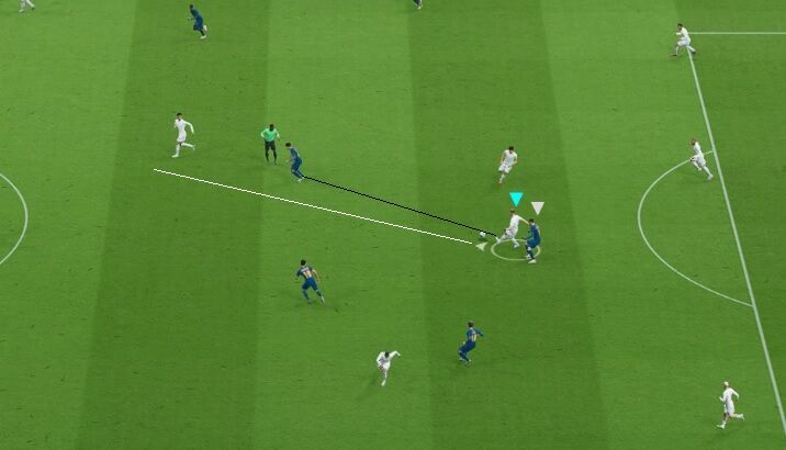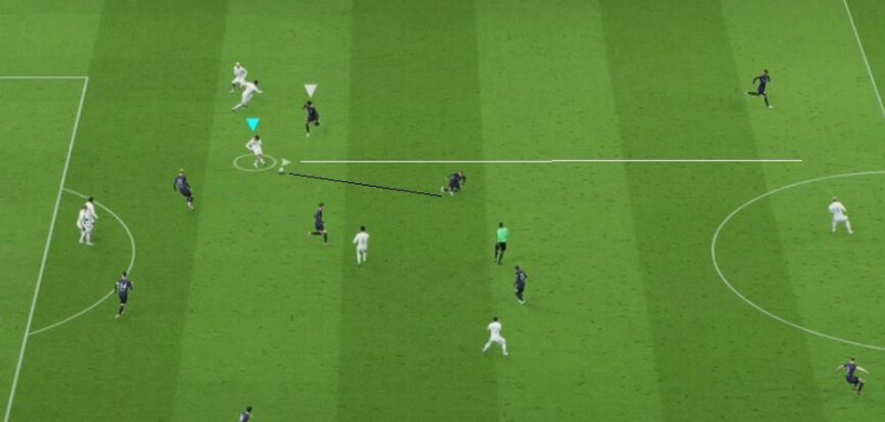 Itt a bal szélen lévő üres területbe akartam tenni a labdát, narancssárgáig felnyomtam, ennek ellenére gyök kettővel rúgta el, hogy az ellenfél játékosáig guruljon csak: