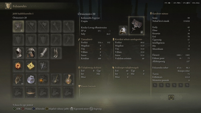 Jut eszembe, én az Ordovis Greatswordot is használtam egy ideig abban a végigjátszásomban (az nem colossal weapon, hanem greatsword kategóriájú, de kegyetleneket üt, és az ash of war-ja, ha van időd teljesen bepörgetni a fegyvert, irdatlan poise sebzést tol ki). -
