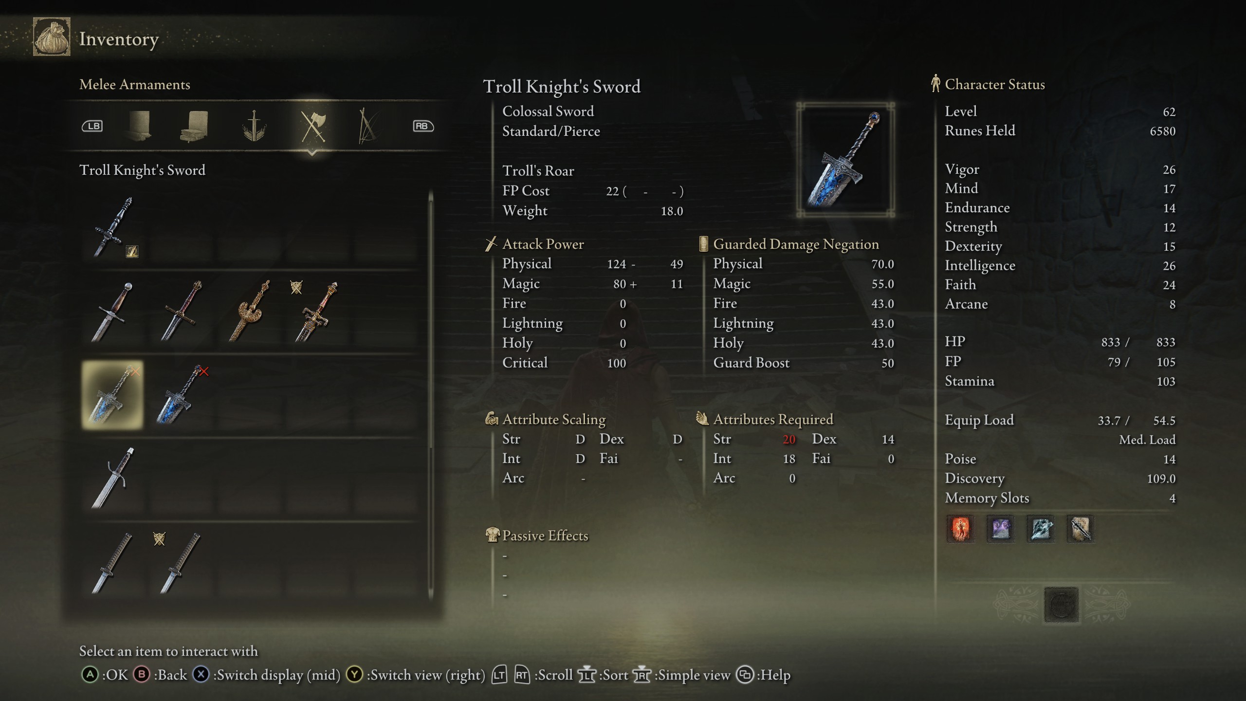 Valahogy összeszedtem kettő Troll Knight's Swordot. Poén lenne dupla kolosszális fegyverrel nyomulni, csak a 20-as erő követelmény a harcos-varázslómnak nem fog összejönni.