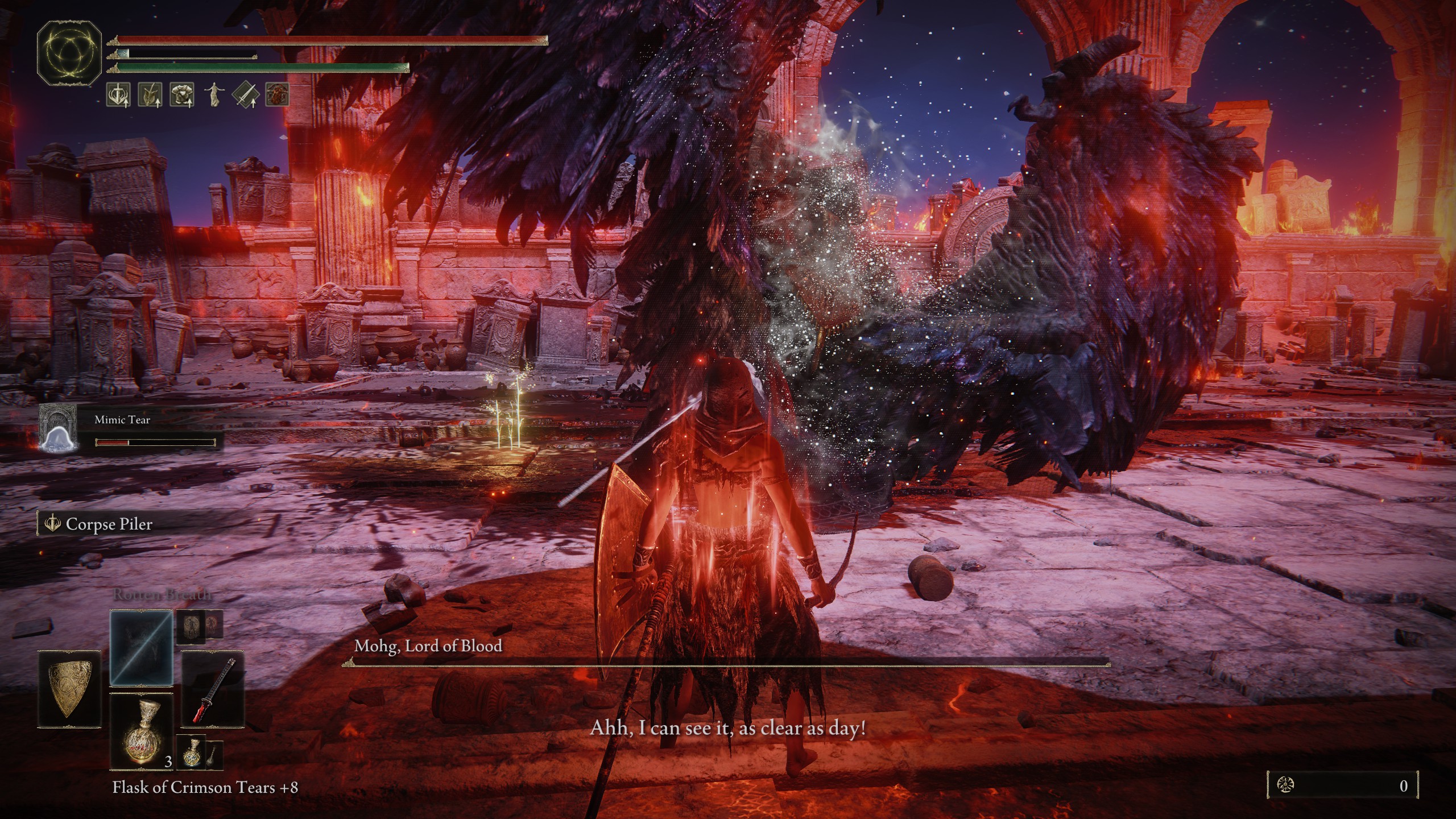 Mondjuk vannak olyan helyzetek, amikor muszáj a Bloodhound's Fanget használni, pl. Margitot csak így tudtam legyőzni (meg kellett a Fiától szerzett Baldachin's Blessing is), mert van, amikor túl rövid a karja, nem találja el az ellent (vagy hiába püföli, 4-5 csapás kellene ahhoz, hogy letérdeljen, de annyira nincs idő).Meg hiányzik a Blood affinity is, de ahhoz előbb le kellene győzni Radahnt, aztán lemenni Nokronba.