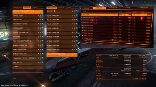 Ez a build szerintem így nem működőképes. Azt látom, hogy mivel nincs elég energia ezért lekapcsolja neked a pajzsot mielőtt elővennéd a fegyvereket. Szerintem hadihajóra nem kell fuel scoop, ugyis mindig csak a lakott űrben repkedsz. A docking computer szintén fölösleges, ezzel a kis agilis géppel bárhol le lehet szállni. Az A-s shield booster jó ötlet de a PP úgysem birja el. Illetve kapcsold ki teljesen a cargo hatch-ot mert úgysem fogod kinyitni soha. (Bár régen láttam egy videot ahol a koma a hatch kinyitásával fékezett harc közben.)
