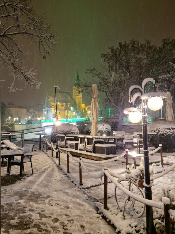 Békéscsaba. Az eső hajnalra átment havazásba, de nem marad meg. Egy kis téli látványosság ismét.