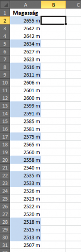 Aztán jött az új kihívás, hogy ezeket a sávokat ki kell emelni úgy, hogy az azonos sávba tartozó magasságok azonos háttérrel, a különböző sávokba tartozó, viszont a táblázatban „szomszédos” magasságok adatai eltérő háttérszínnel jelenjenek meg! Első sáv adatai fehér, következő kék...stb. Csak arra nem figyeltem, hogy a színezés automatikusan reagáljon minden (a magasságok eredeti, monoton csökkenő rendezettségét megtartó) adatváltozásra! Tehát, ha pl. a 2634 m-es magasságot átírom 2640 m-re, akkor így már az a 40-es sávba fog tartozni, tehát kék színű. A 30-as sáv gyakorisága 0, a 20-as sávnak így fehérnek kell lennie.