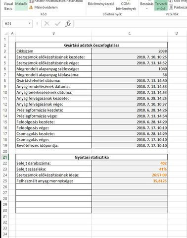 Nekem egy olyan problémám lenne, hogy egy nagyon hosszú táblázatból statisztikát szeretnék készíteni az egyes sorok végén. A táblázat a képeken látható termelési táblázat, ami nagyon hosszú, most csak az elejét és végét raktam be. Minden sorban egy cikkszám szerepel, és a lényeg az lenne, hogy a végén a statisztika gombra kattintva felhozza az excel magától azokat az adatokat, amiket kiiírtam én most egy külön munkalapra(6. kép). Ezek az adatok a táblázatban benne vannak, de az is elegendő lenne ,ha csak a narancssárgán írt gyártási statisztikát dobja fel, amiket szintén kiszámol még a hosszú színes táblázatban.