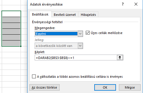 pl.: A1:A100 tartományban a cellák 15 karaktert tartalmazhatnak -