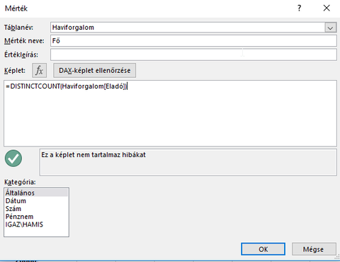 Ebben a Pivot-ban lehet használni a DAX függvényeket, amelyek közül most a DISTINCTCOUNT kell, amely az oszlopban lévő egyedi értékeket számolja meg. Ha magára az értékre van szükség, akkor a VALUES függvény kell.