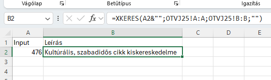 Feri csak arra figyelmeztet, hogy a kereső függvények csak azonos típusok (szöveget szövegekben és számokat számok) között tud keresni. Excelben a számokat szövegként is lehet tárolni (ilyenkor a számok balra vannak a cellában automatikusan igazítva, míg a számok jobbra igazodnak).Az OTVJ25 lapon a számok szövegként vannak, ezért ha az EV lapra számként írod be őket akkor nem lenne találat, de a képletben a &"" résszel mindent szöveggé alakítunk, így műkődni fog a képlet.