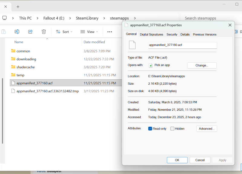 Ahova telepítve van a Fallout4 vagy magában a steam mappában az appmanifest_377160.acf-nél tedd át "Read-Only"-ra. Így a Steam képtelen lesz ráfrissíteni.