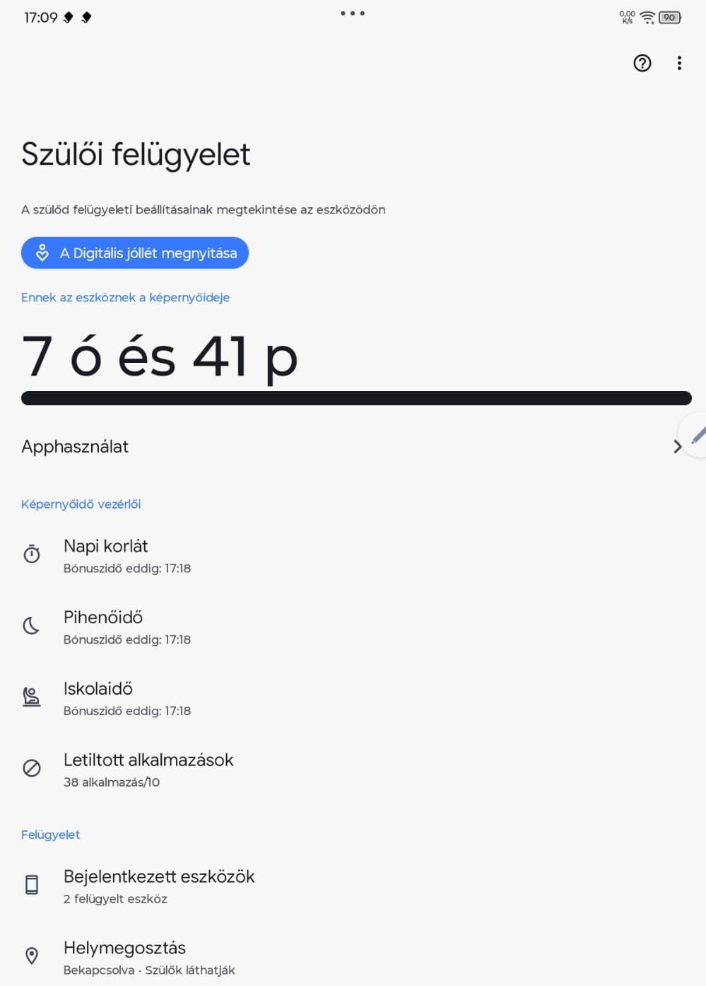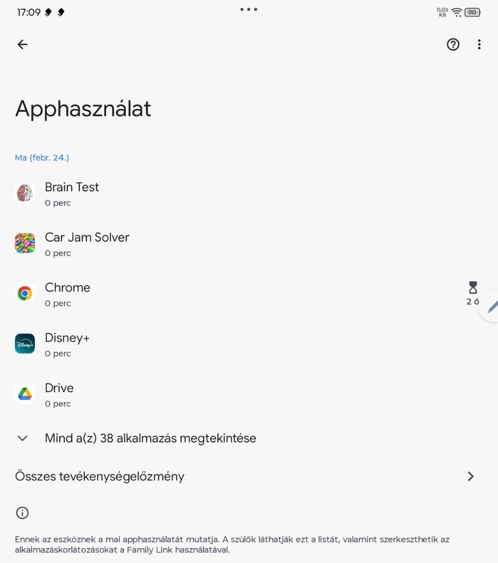 A Google térképes tippet köszi.A másik, amit még észre vettem, és nem tudom hova tenni: 2 óra képernyőidő van adva neki naponta. A számláló szerint adott napon elhasznált 1:30-at, vagy 1:40-et, vagy 1:25-öt (mikor mennyit), de kiírja, hogy korlátozva. Ha összeadom a különböző alkalmazásokban eltelt időt, tényleg nem jön ki a 2 óra
