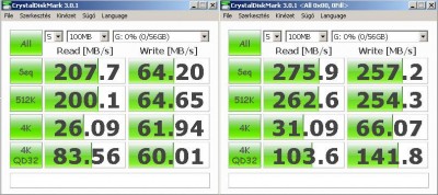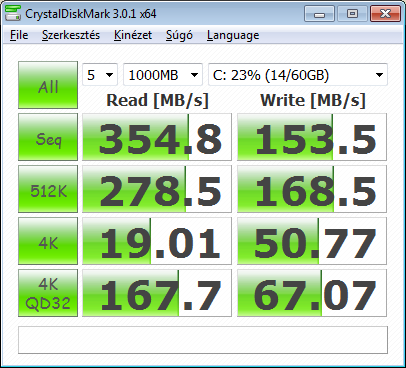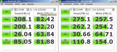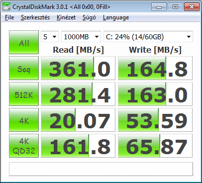 Az írás rendben van, de az olvasása az elmarad jócskán a gyári adatoktól (520/160 MB/s)
