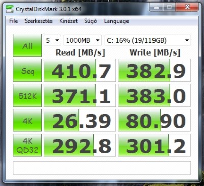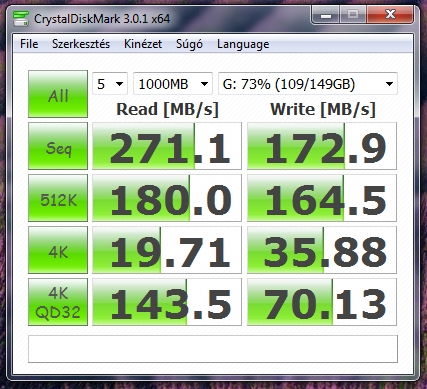 Nagyjából a korábban mért értékeket kaptam, minimális eltéréssel (az első három érték 1 MB/s-el rosszabb, a második három kb. ugyanennyivel jobb lett; gyakorlatilag mérési hibahatár).