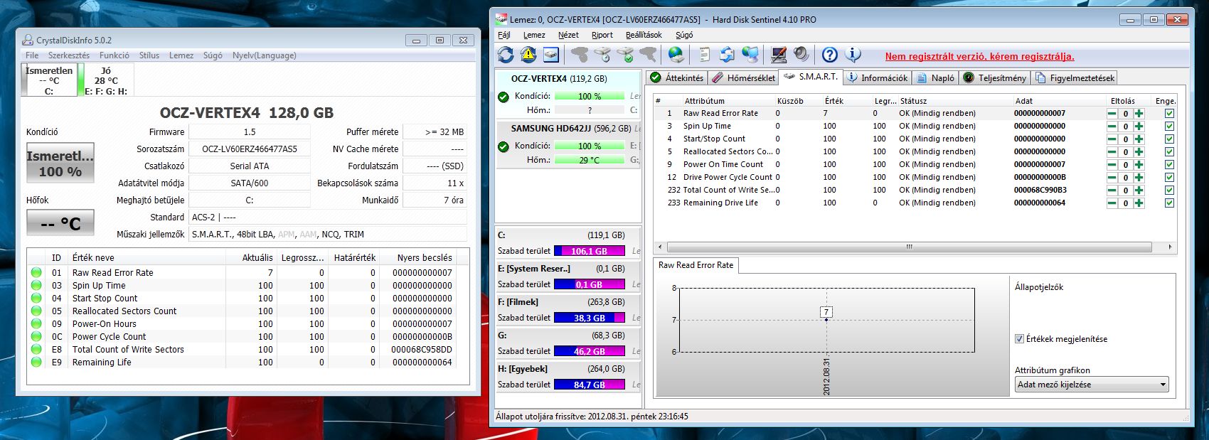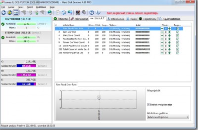 A csatolt képen nincsenek hibás szektorok, a "Raw read error rate" attribútumot látom 7-es értékkel,