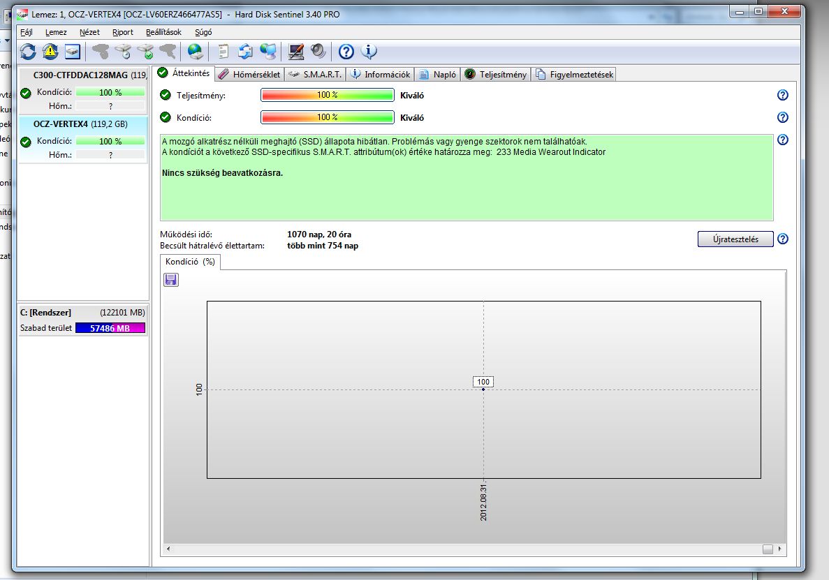 állapotot mutat és ezért a 100% kondíció.A másik említett programban sem látható hibás szektor."