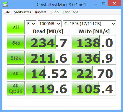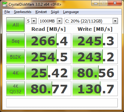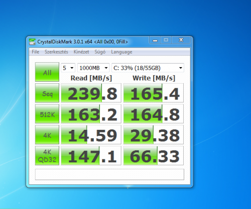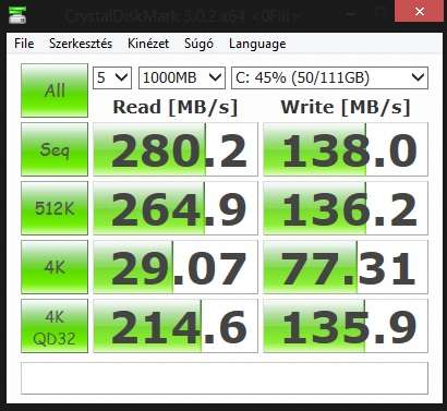 Win 7 hp x64 ahogy felment tiszta installal, indítom cdm-et, minden érték rendben kivéve a 4k írás/olvasást, 5,8 ill 5,6 MB/s csak gyári driverrel. (seq 435/164, 512K 262/165, 4kqd32 183/65)