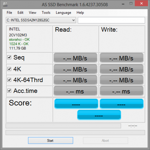 Win8pro x64 120GB Intel X25-M SSD-re történt telepítése után AS SSD szépen jelzi, hogy rendben minden: