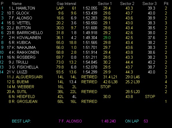 Egész jo kis verseny a végeredménytől eltekintve persze ez saját vélemény. Jo volt a mclaren de mondjuk ugy több tényező is hozzá segítette a pilotájukat a győzelemhez, ami nem rajta múlt.