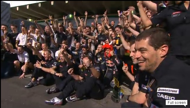 Ekkor pontegyenlőség alakul ki. Erre felbuzdulva Webber elkezdené püfölni Vettelt, majd kiesnek mint Törökországban
